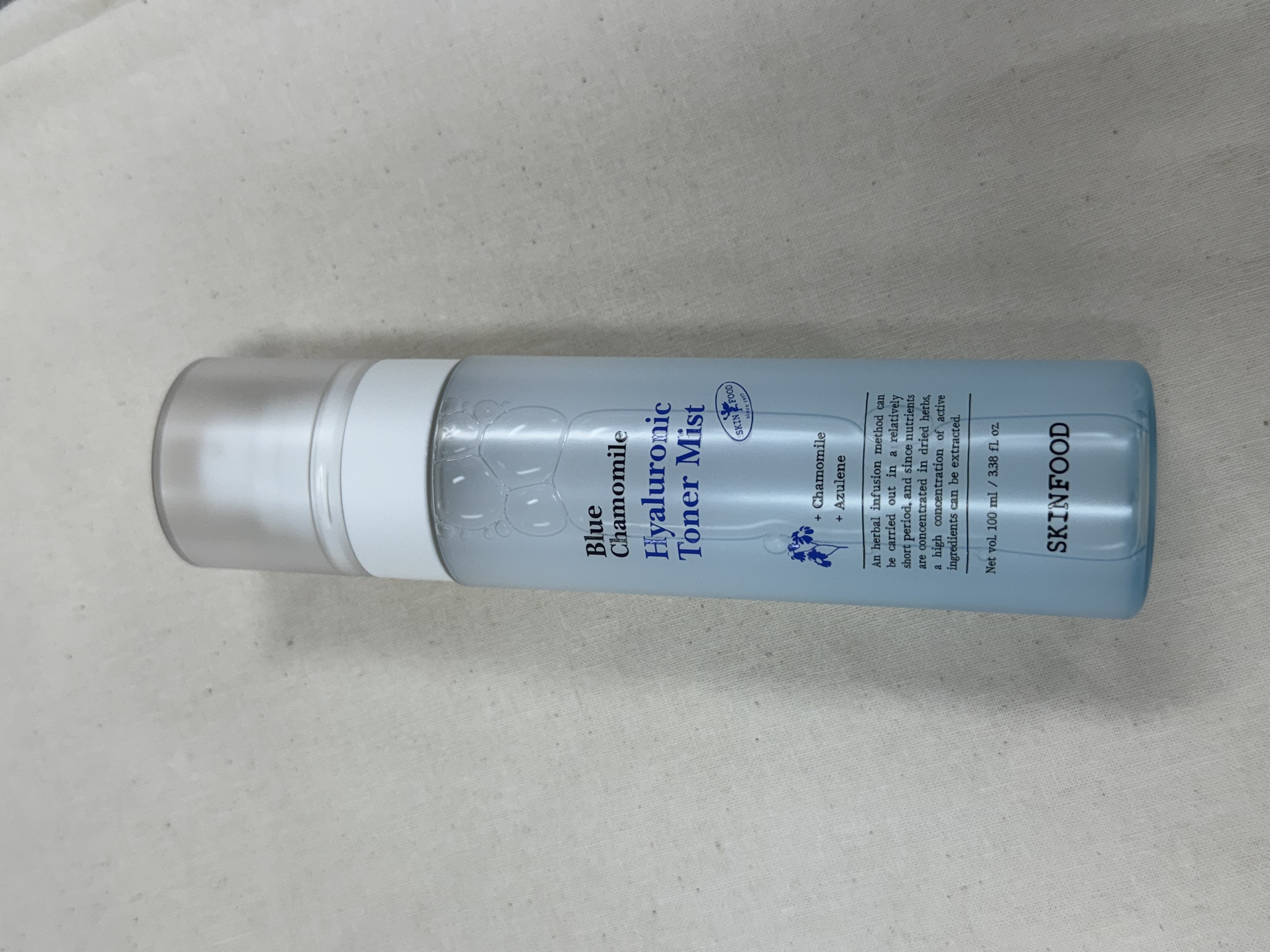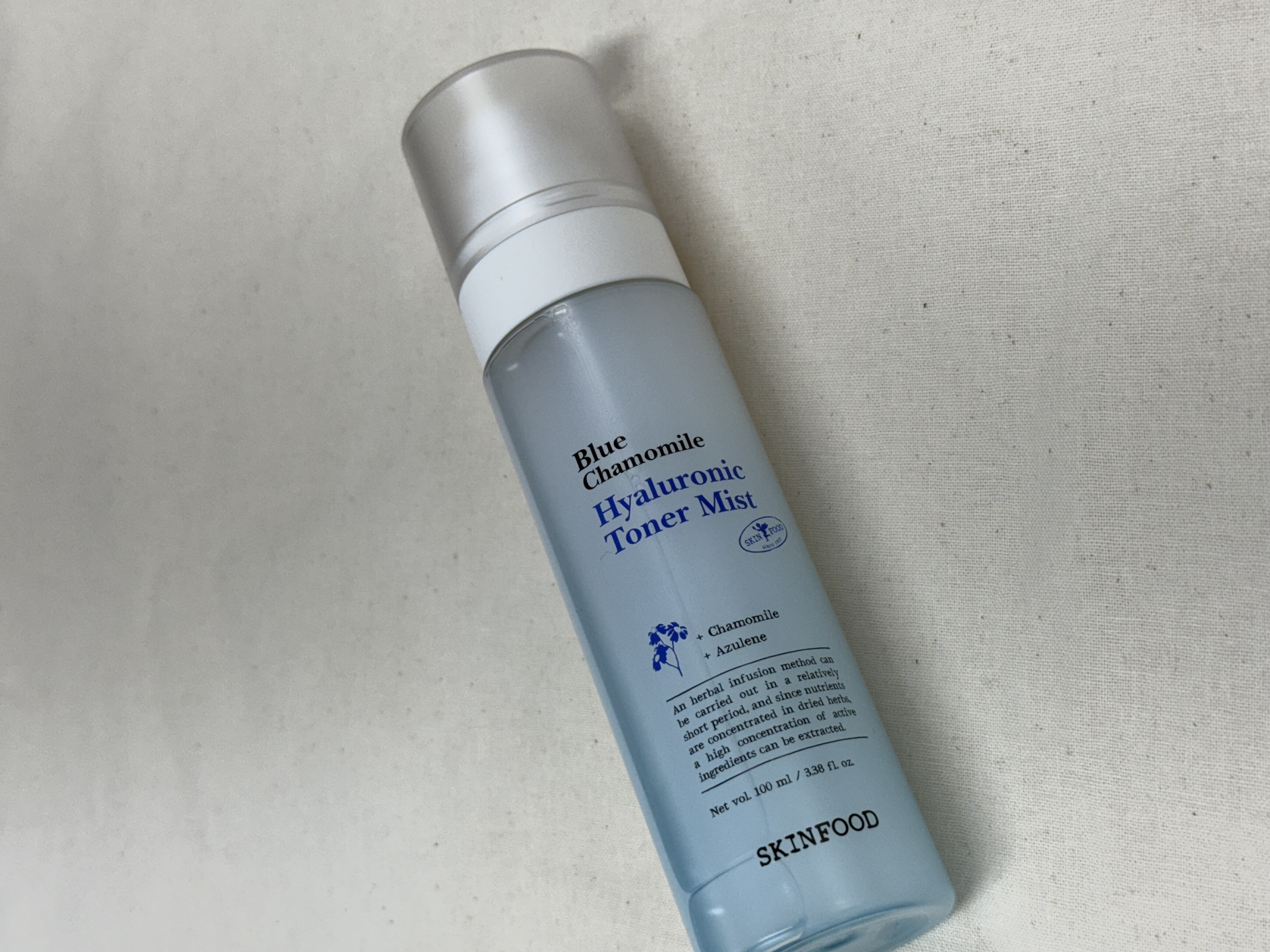 I grabbed the Skinfood Blue Chamomile Hyaluronic Toner Mist on a whim because I wanted something easy I could keep in my backpack and spritz whenever my face felt tired. I’m not super into complicated skincare stuff, so a mist sounded perfect: point, spray, done. First impression was honestly just how cute and chill it feels to use. The bottle is simple, and the mist comes out nice and even, no angry water jets, no wet circles on my cheeks. It’s that soft cloud kind of spray you want, where it lands everywhere and you don’t have to pat anything in unless you want to.