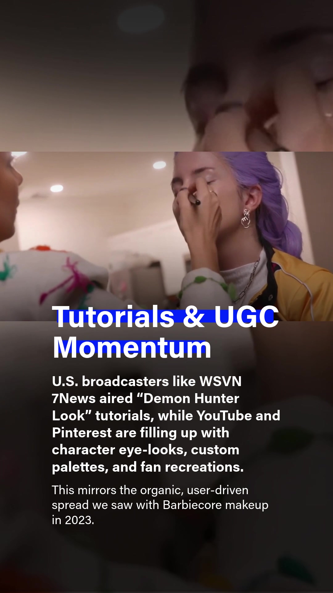 Meanwhile, across the U.S. and other markets, UGC (user-generated content) has been thriving. Local broadcasters like WSVN 7News ran on-air makeup tutorials themed “Demon Hunter Look,” while YouTube creators and Pinterest users began uploading detailed step-by-step recreations of eye makeup, custom palettes, and full cosplay-inspired looks.