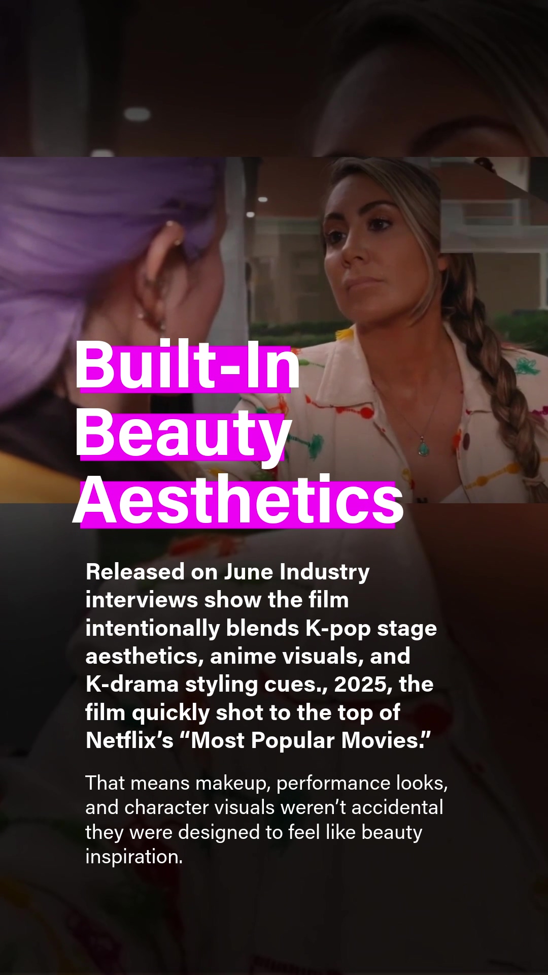 What makes KPop Demon Hunters particularly relevant for beauty is its design language. According to animation and entertainment media interviews, the creative team intentionally blended K-pop performance aesthetics, anime-inspired visuals, and K-drama-style storytelling.