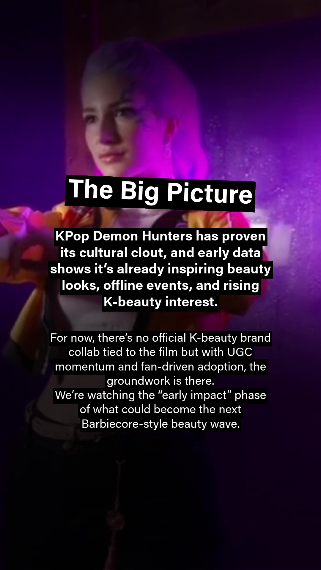 At the same time, it’s important to note what hasn’t happened yet. Unlike Barbiecore, which quickly spawned limited-edition collections and brand collabs, KPop Demon Hunters hasn’t yet been tied to official K-beauty collaborations. That doesn’t diminish the momentum it just means we’re in the early impact phase, where user activity and brand interest are building.