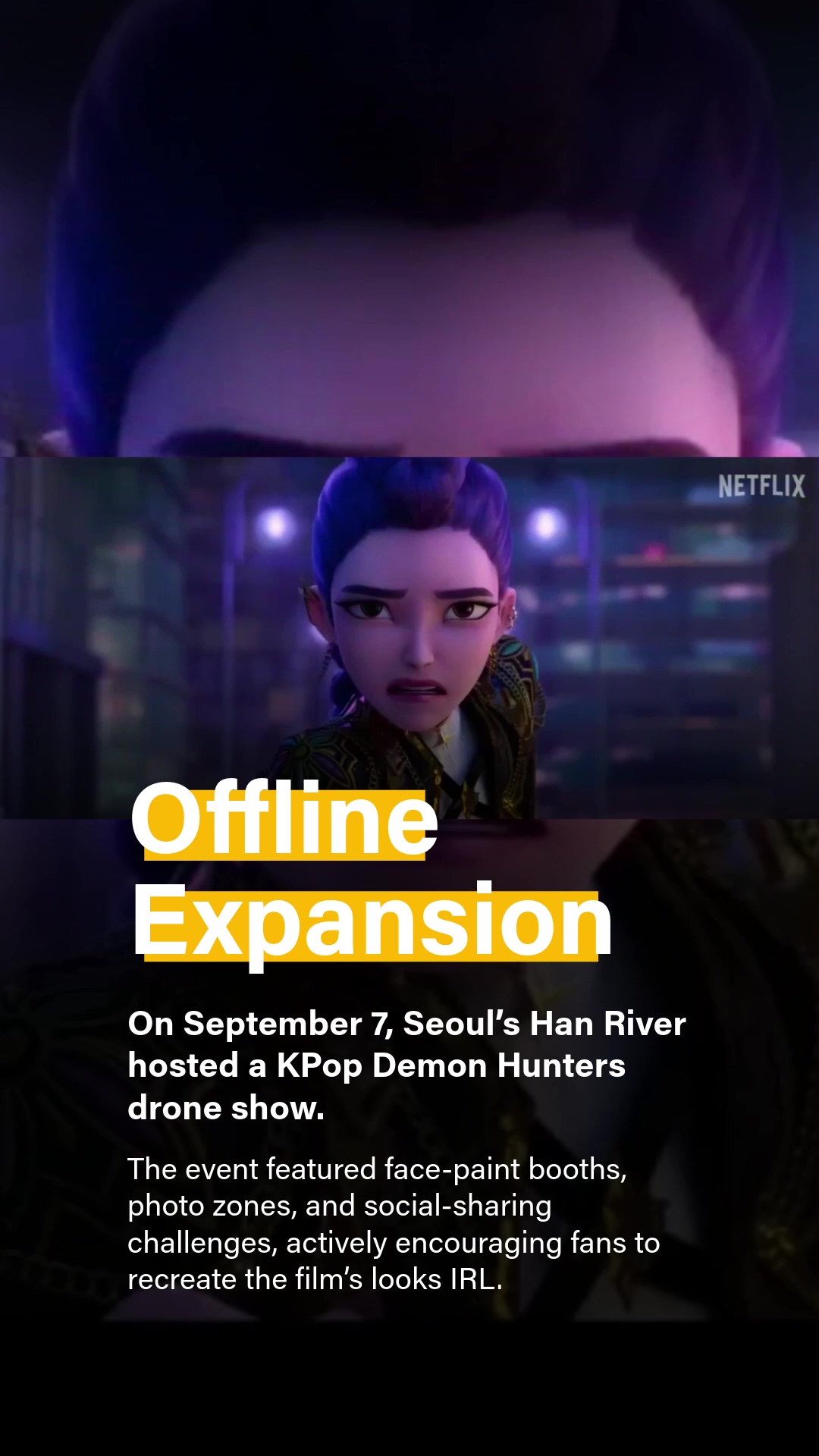 The film’s cultural reach quickly extended offline. On September 7, 2025, Seoul’s Han River became the stage for a KPop Demon Hunters–themed drone show. Hundreds of drones painted scenes and characters from the movie in the night sky.