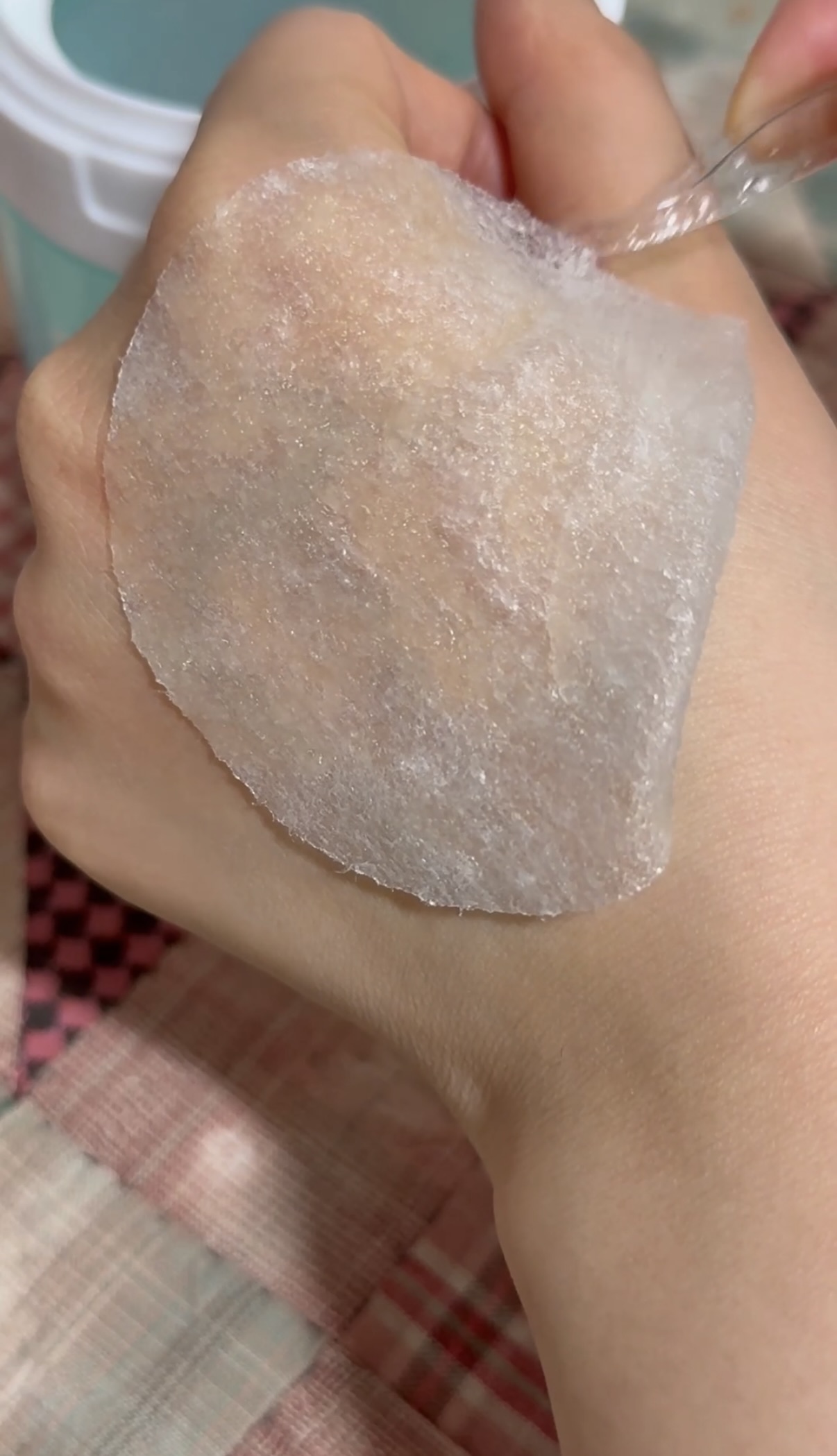 The material looks a bit gauze-like at first glance, but it is not stiff or scratchy. It is soft, and it seems to hold the essence within the pad rather than just on the surface. That is why the moisture lasts. I can put a pad on my cheek, do ten minutes of normal morning chaos, and when I peel it off the pad is still properly damp. With thinner pads, I usually get that halfway point where the pad starts feeling like a damp cloth rather than a wet one, and at that stage it is easy to start tugging without meaning to. That does not happen here.